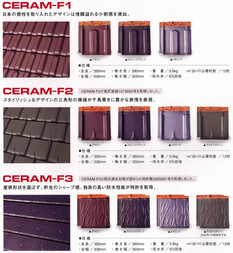 瓦には、古来よりの伝統的なものもあれば、甍の波に代表されるデザイン、またフラットな板状など、異型のものも作られてきている。現在でも、JIS規格外のもの、国内で発明されたものから外来のものまで様々なものがあります。